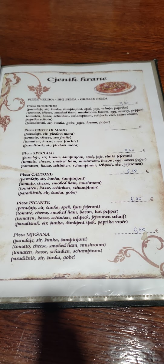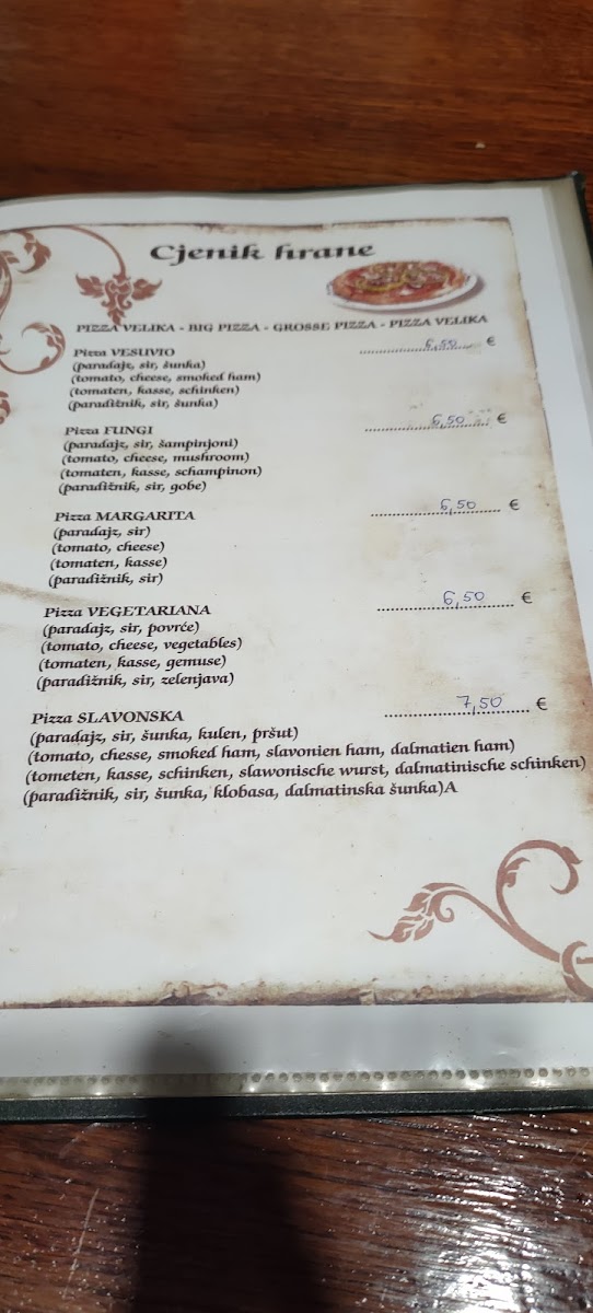 The menu is straightforward yet satisfying, primarily showcasing an assortment of pizzas. Options include a large pizza, perfect for a hungry adult or two slightly hungry friends at just 45kn, and a small pizza for a modest appetite, priced at 35kn. Reviewers rave about the quality and authenticity, highlighting the generous portions and affordable prices.